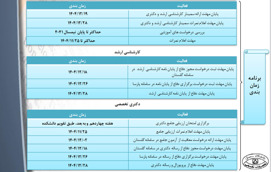 – مهلت ارائه سمینارهای کارشناسی ارشد ناپیوسته و دکتری تخصصی حداکثر تا 1404/12/19 و مهلت اعلام و ثبت نمره نهایی در سامانه گلستان توسط استاد حداکثر تا 1404/12/28.