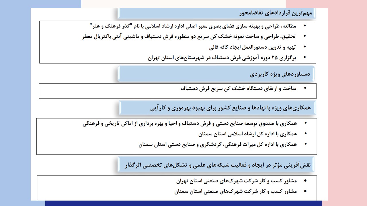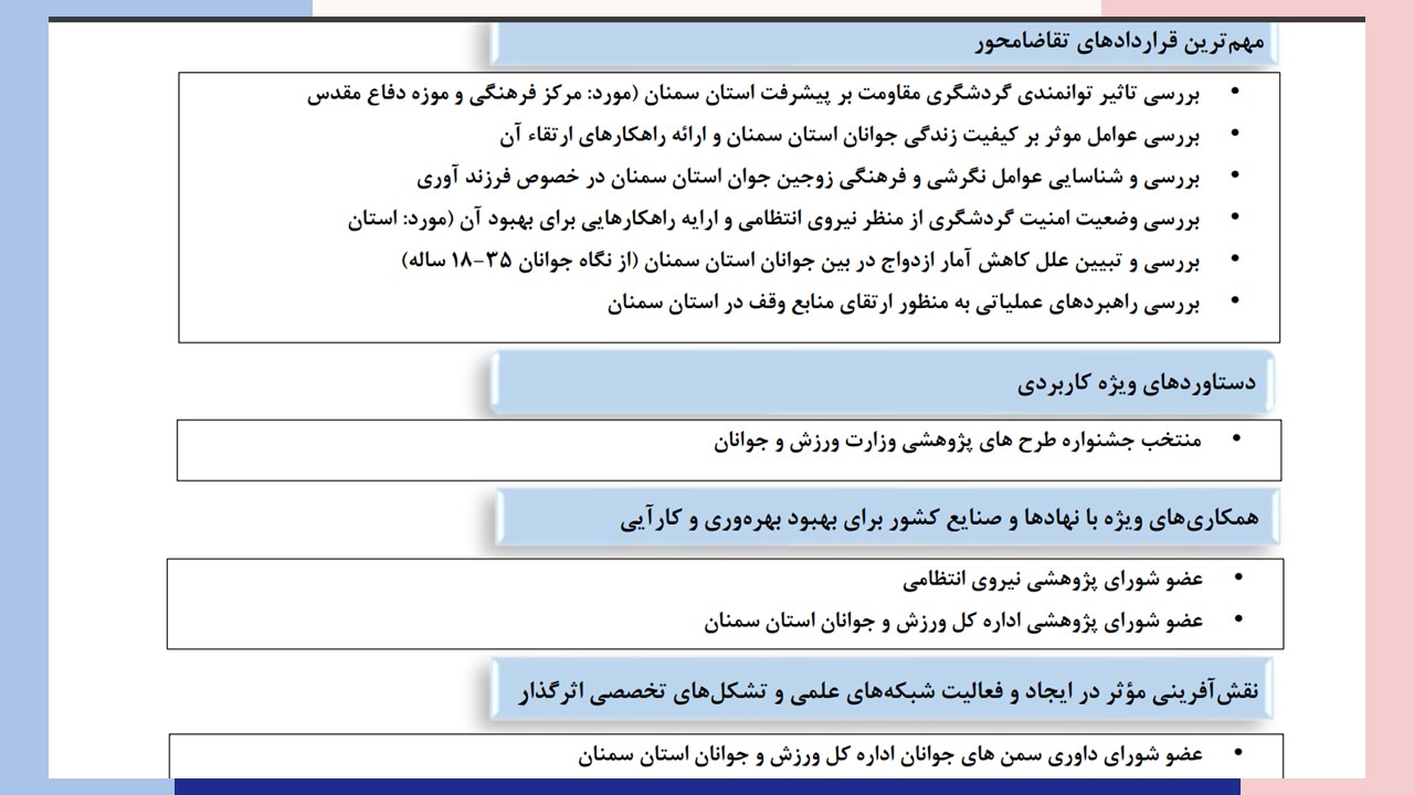 معاون پژوهش و فناوری دانشگاه سمنان تصریح کرد :با ارزیابی صورت گرفته بر اساس شاخص های متعددی همچون : تجارب مشارکت در فعالیت ها و برنامه ریزی های ملی و منطقه ای ، انعقاد قراردادهای تقاضامحور ، دستاوردهای ویژه کاربردی و مؤثر در رفع مشکلات کشور ، همکاری های ویژه با نهادها و صنایع کشور برای بهبود بهره وری و کارآیی و نقش آفرینی مؤثر در ایجاد و فعالیت شبکه های علمی و تشکل های تخصصی اثرگذار این اعضای هیأت علمی توانسته اند در فهرست برترین های کشور حضور یابند.