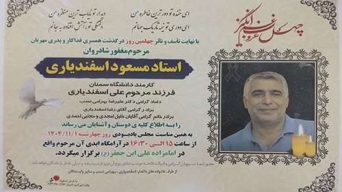 اطلاعیه مراسم چهلمین روز درگذشت مرحوم مغفور شادروان مهندس مسعود اسفندیاری همکار محترم دانشگاه 1404/10/29 - 09:05 تعداد بازدید: 248 کلمات کلیدی