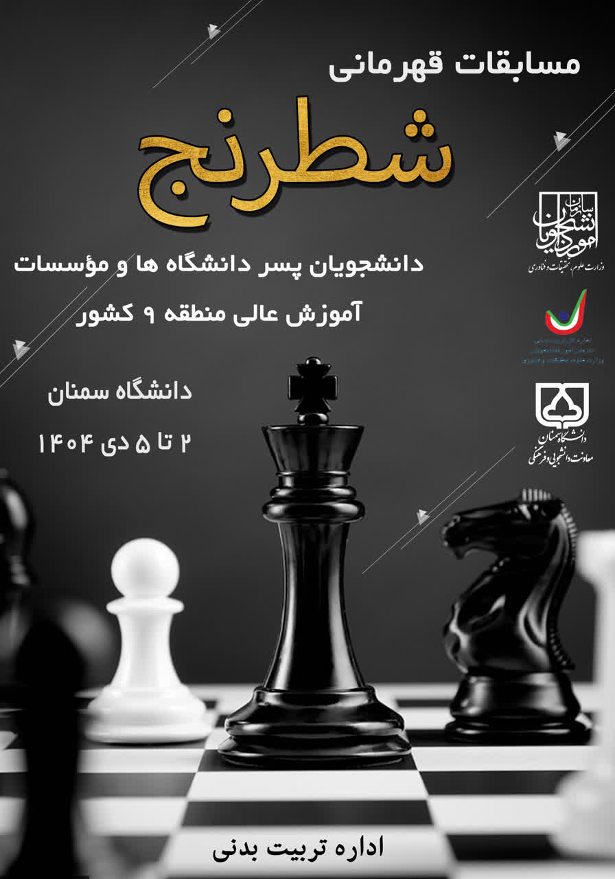 سرپرست اداره تربیت بدنی دانشگاه سمنان با اشاره به اینکه رقابتهای شطرنج نیز دوم تا پنجم دی برگزار می شود اظهار داشت : این رقابتها با حضور شش تیم از دانشگاههای فردوسی مشهد، بجنورد، گرمسار، بیرجند، غیرانتفاعی عطار نیشابوری و دانشگاه سمنان برگزار خواهد شد.