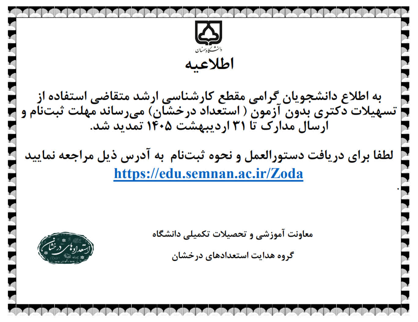 به استحضار میرساند مهلت ثبتنام در فراخوان پذیرش دانشجو بدون آزمون (استعدادهای درخشان) مقطع کارشناسیارشد و دکتری دانشگاه سمنان برای سال تحصیلی ۰۶-۱۴۰۵ تا تاریخ ۳۱ اردیبهشت ۱۴۰۵ تمدید شده است، متقاضیان محترم میتوانند برای کسب اطلاعات بیشتر به آدرسهای https://edu.semnan.ac.ir/Zoda و https://semnan.ac.ir/ZLFa مراجعه نمایند.