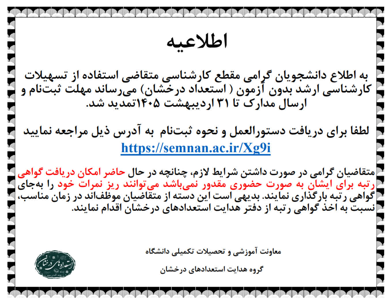 تمدید فراخوان ثبتنام پذیرش دانشجو بدون آزمون (استعداد درخشان) در مقطع کارشناسی ارشد و دکتری
