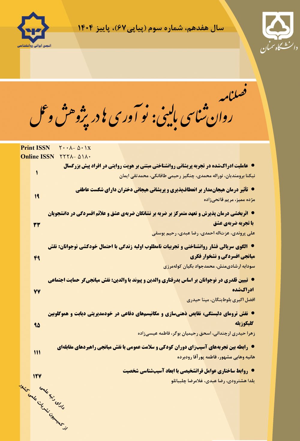 تغییر شماره شاپا فصلنامه «روانشناسی بالینی: نوآوری ها در پژوهش وعمل»