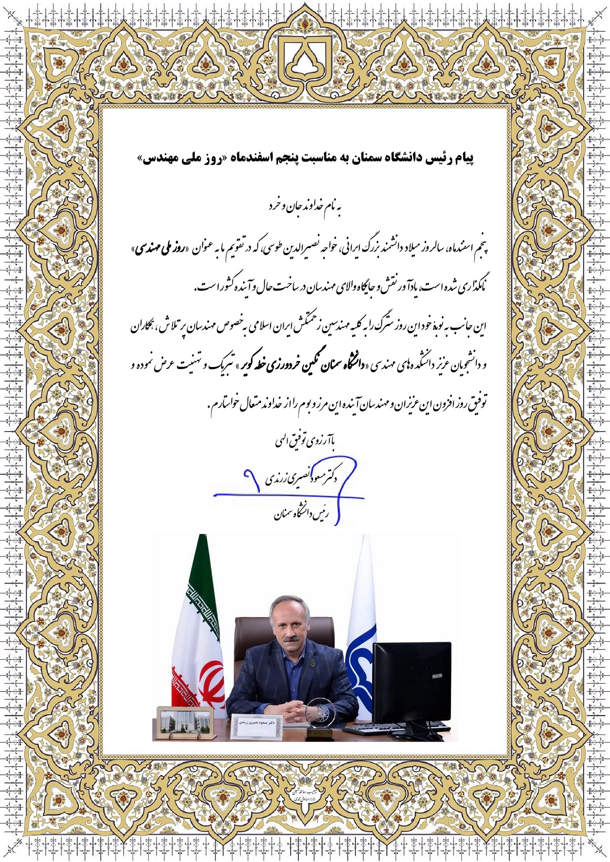 این جانب به نوبۀ خود این روز سترگ را به کلیه مهندسین زحمتکش ایران اسلامی  به خصوص مهندسان پر تلاش ، همکاران و دانشجویان عزیز دانشکده‌های مهندسی «دانشگاه سمنان نگین خردورزی خطه کویر » تبریک و تهنیت عرض نموده و  توفیق روز افزون این عزیزان و مهندسان آینده این مرز و بوم را از  خداوند متعال خواستارم.