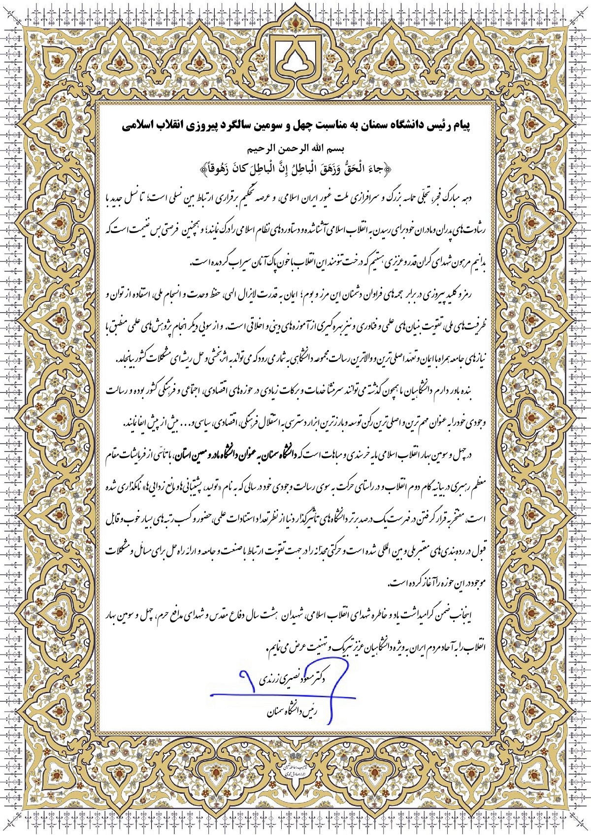 اینجانب ضمن گرامیداشت یاد و خاطره شهدای انقلاب اسلامی، شهیدان هشت سال دفاع مقدس و شهدای مدافع حرم، چهل و سومین بهار انقلاب را به آحاد مردم ایران به ویژه دانشگاهیان عزیز تبریک  و تهنیت عرض می‌نمایم.
