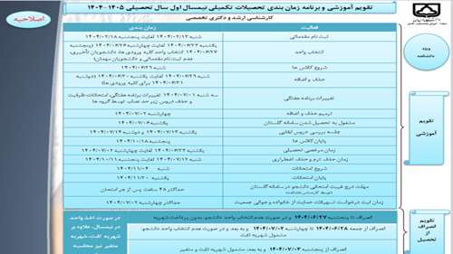 – مهلت ارائه سمینارهای کارشناسی ارشد ناپیوسته و دکتری تخصصی حداکثر تا 1404/12/19 و مهلت اعلام و ثبت نمره نهایی در سامانه گلستان توسط استاد حداکثر تا 1404/12/28.