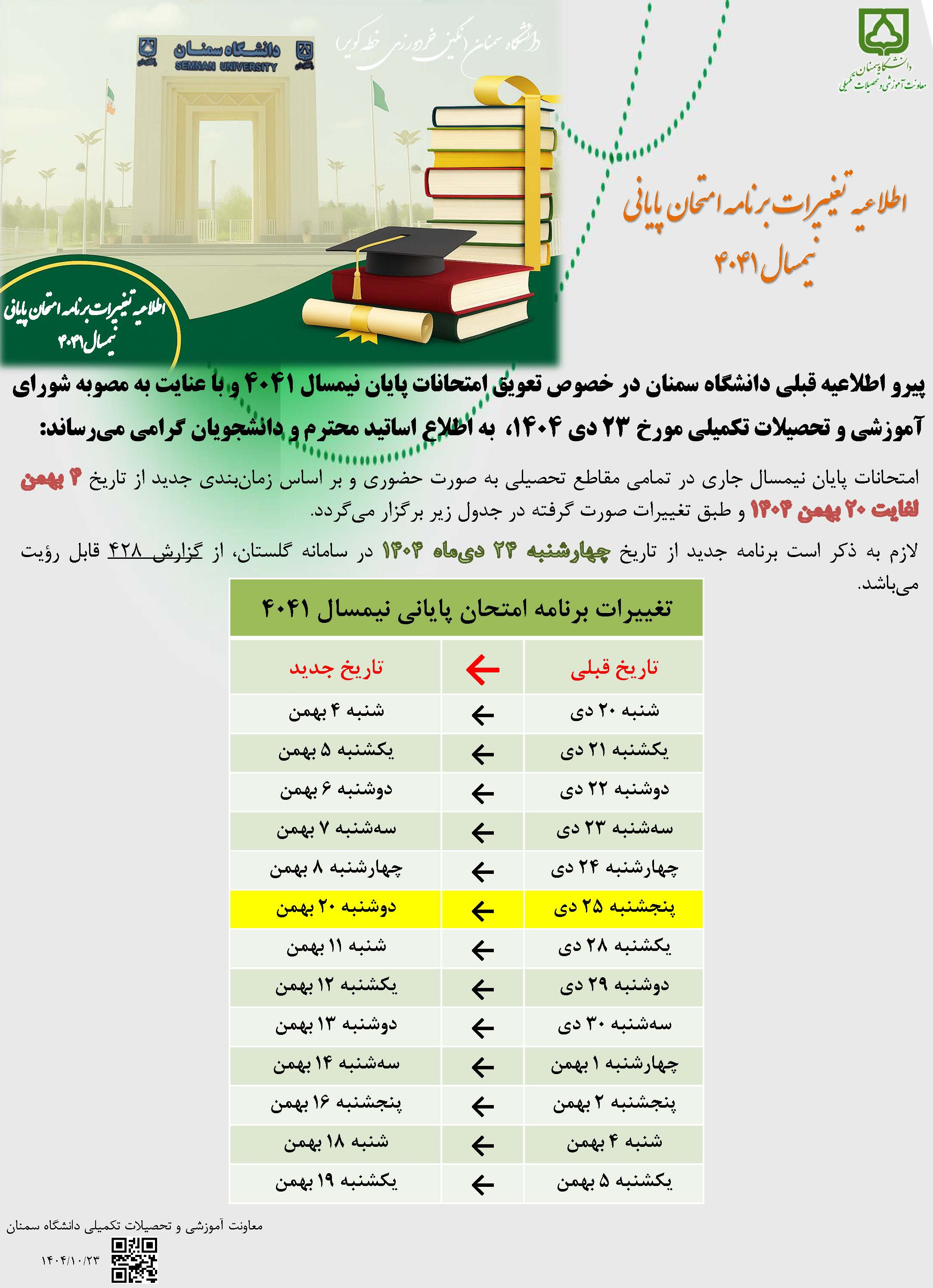 اطلاعیه تغییرات برنامه امتحان پایانی نیمسال 4041