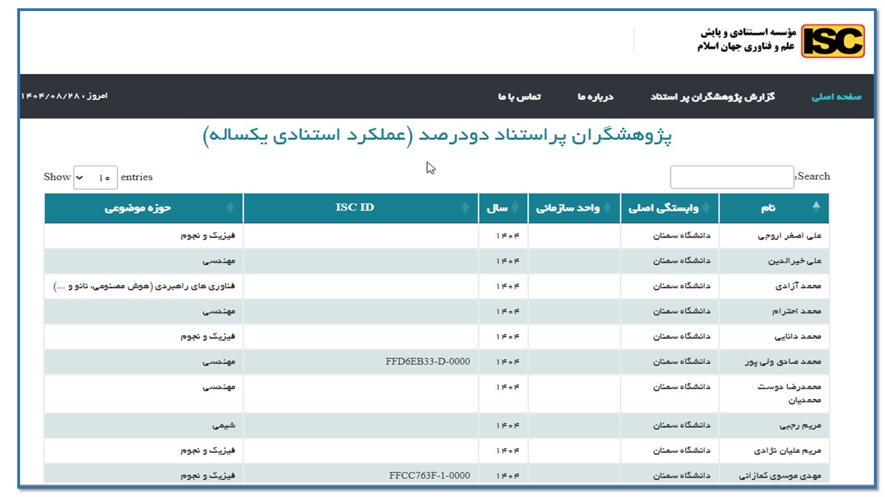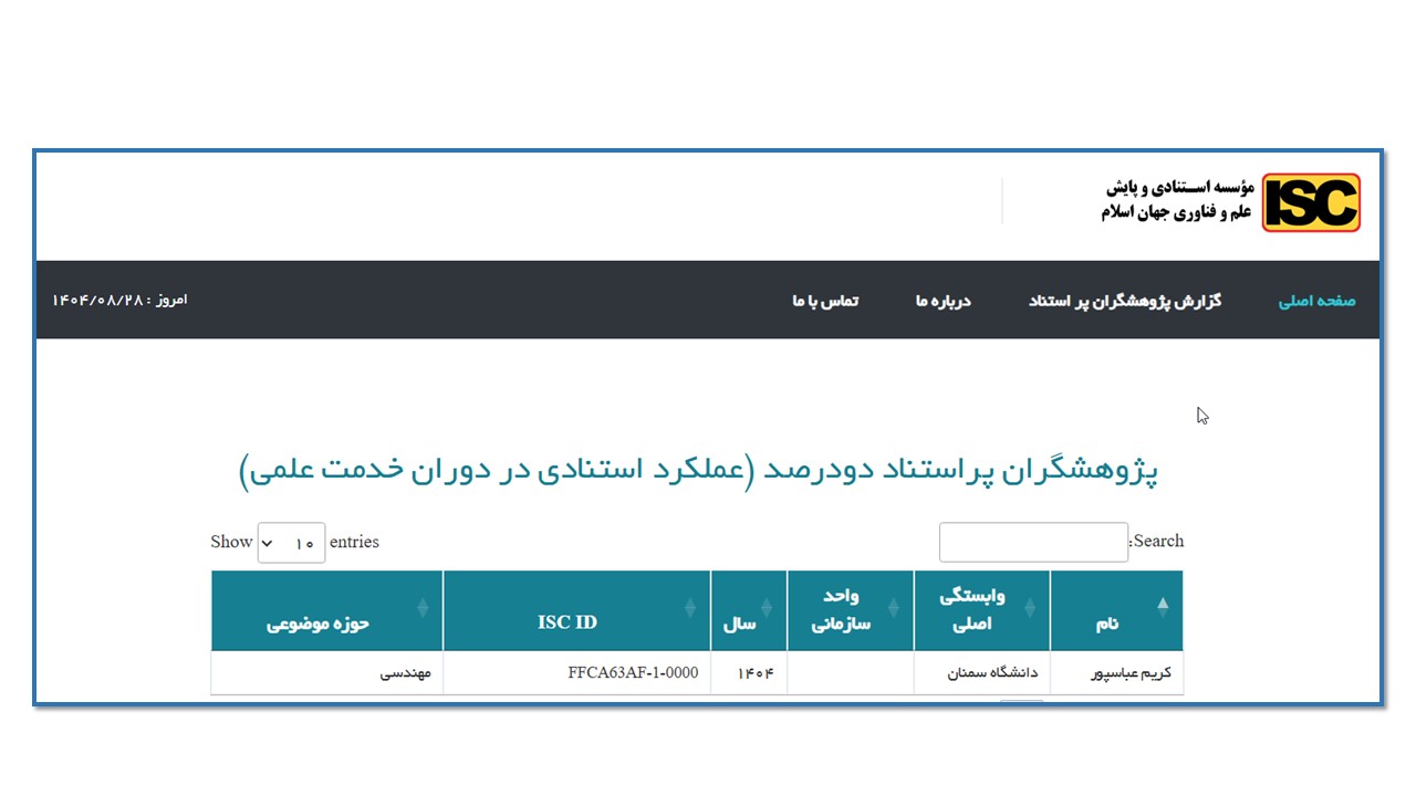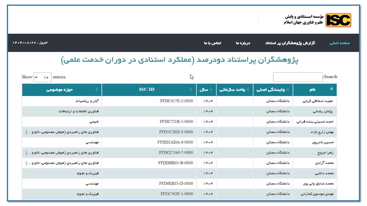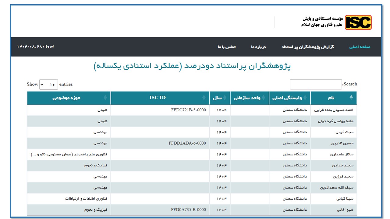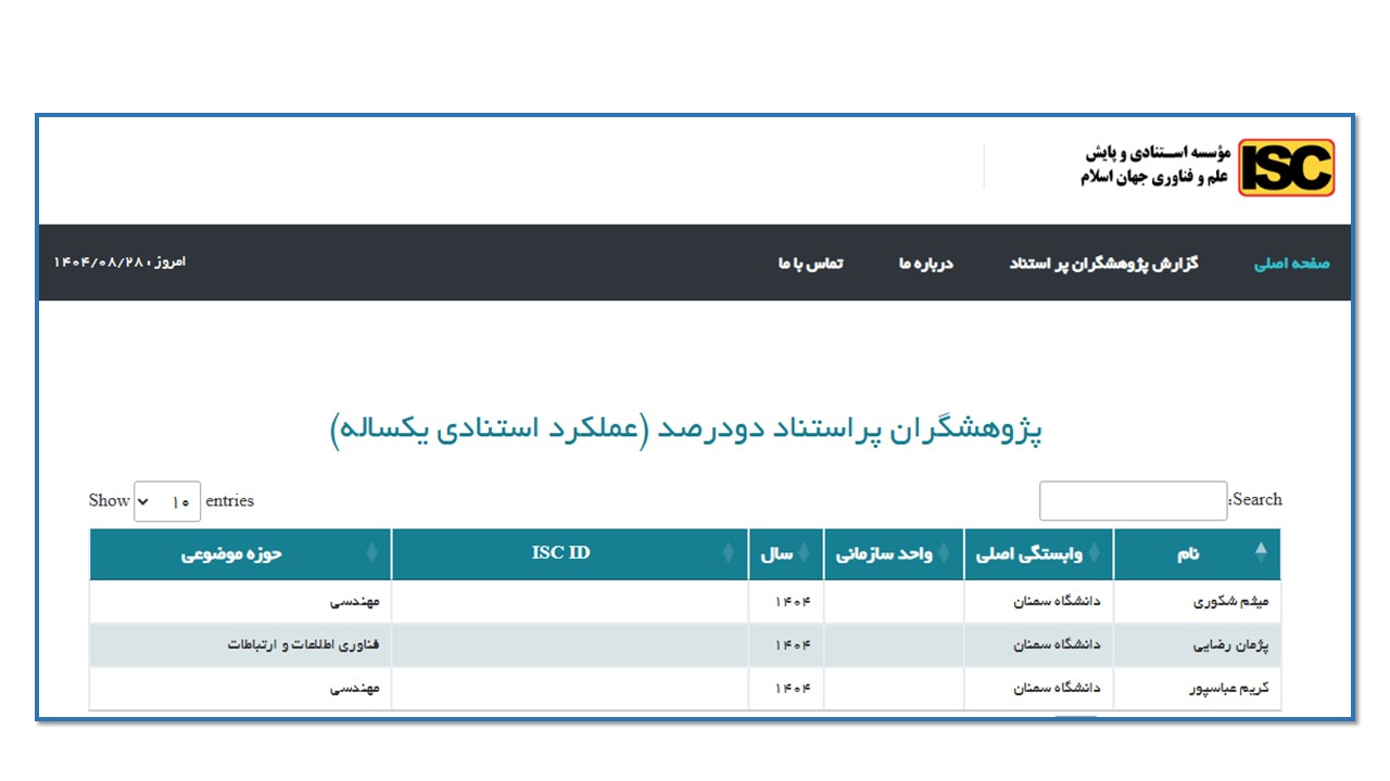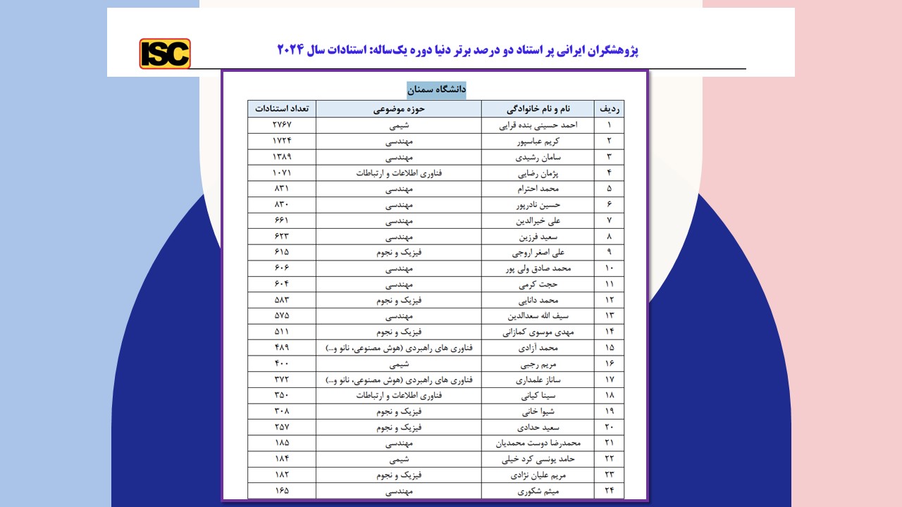 به گزارش روابط عمومی دانشگاه سمنان ؛ دکتر محمد حسین احسانی با اعلام این خبر گفت : در تازه‌ترین به‌روزرسانی پایگاه ISC که به تازگی منتشر شده است، 26 پژوهشگر از دانشگاه سمنان در فهرست پژوهشگران پراستناد دو درصد برتر جهان قرار گرفته‌اند. این فهرست بر اساس عملکرد استنادی یک‌ساله در سال ۲۰۲۴ و همچنین تحلیل عملکرد استنادی نویسندگان در دوران خدمت علمی از سال ۱۹۶۰ تا ۲۰۲۴ تنظیم شده است.