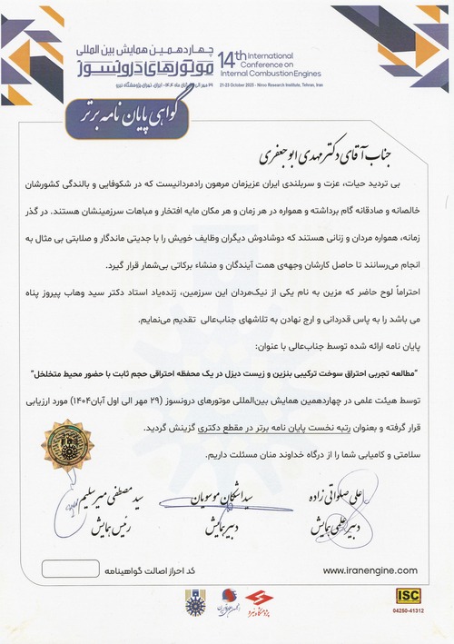 به گزارش روابط عمومی دانشگاه سمنان ؛ دکتر علیرضا آلبویه با اعلام این خبر گفت : رساله دکتر مهدی ابوجعفری، فارغ‌التحصیل رشته مهندسی مکانیک دانشگاه سمنان، با موضوع «مطالعه تجربی احتراق سوخت ترکیبی بنزین و زیست دیزل در یک محفظه احتراقی حجم ثابت با حضور محیط متخلخل» به عنوان رساله برتر مقطع دکتری در جشنواره علمی- فنی چهاردهمین همایش بین‌المللی موتورهای درونسوز انتخاب شد و لوح تقدیر مزین به نام زنده‌یاد استاد وهاب پیروزپناه، از اساتید علم موتورهای درونسوز به وی اهدا شد.