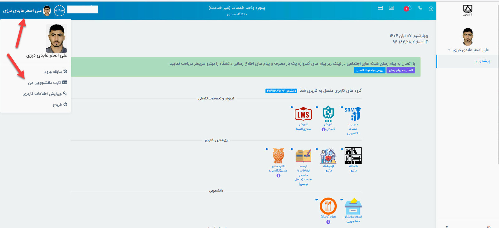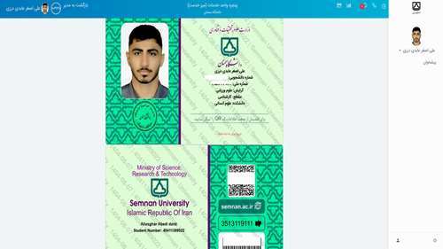 دکتر نعیمی صدیق با بیان اینکه هر دانشجو برای مشاهده کارت دانشجویی دیجیتال خود در پنل My دسترسی دارد افزود : این کارت مجهز به بارکد یکتا بوده و امکان احراز هویت سریع در ورودی اماکن دانشگاه، استفاده از خدمات آموزشی، رفاهی و فرهنگی را بدون نیاز به کارت فیزیکی ( به دلیل قابلیت تشخیص چهره بودن و همچنین اتصال به سامانه مرکزی در همه سامانه ها) فراهم میسازد.